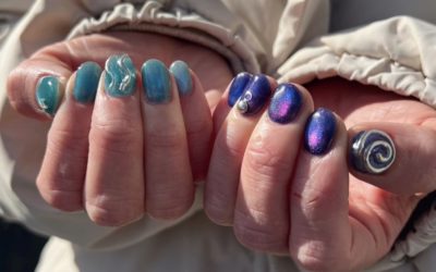 当店ネイリスト荻野にネイルしてもらいました☆ マグネットネイルに左手は宇宙をイメージして ぐるぐるをポイントに 右手は水をイメージして なみなみをポイントにデザインしてもらいました♪
